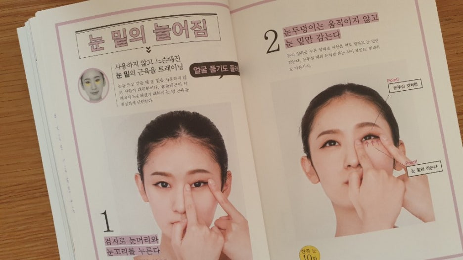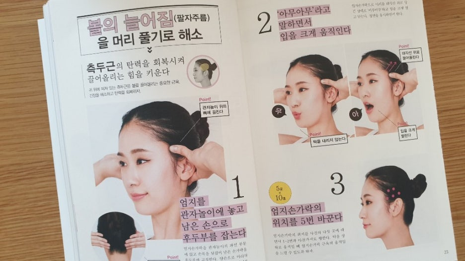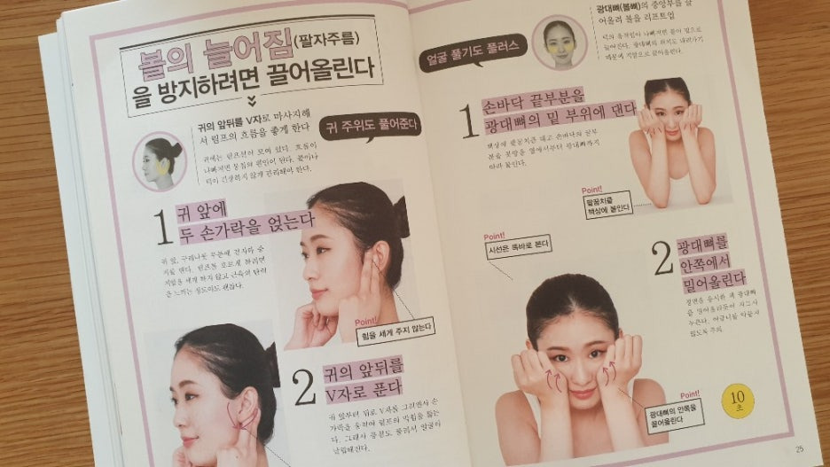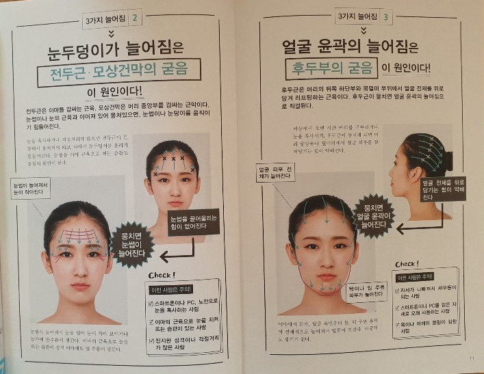 눈 밑 늘어짐, 눈꼬리 주름, 이마 주름, 미간 주름, 볼의 패임, 입꼬리 처짐, 하관 붓기, 목덜미 주름 등 각 부위별로 머리 풀기 방법과 얼굴 풀기 방법을 큼직한 사진과 자세한 설명으로 소개해 줍니다. 손의 어느 부분을 사용하여 마사지하면 좋은 지도 함께 알려주므로 읽어보면 쉽게 따라 할 수 있어요.