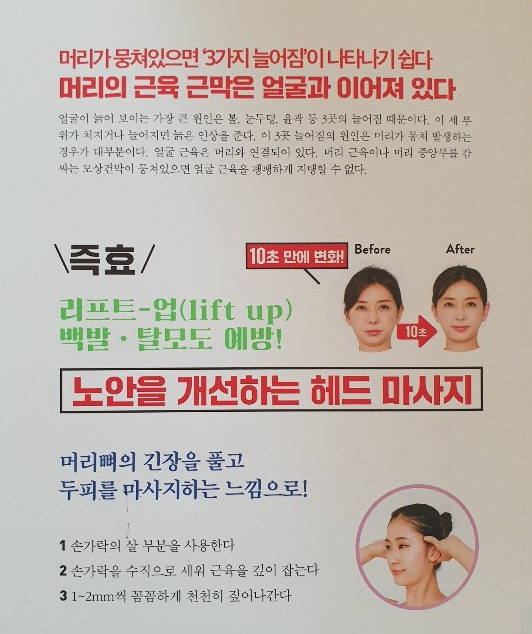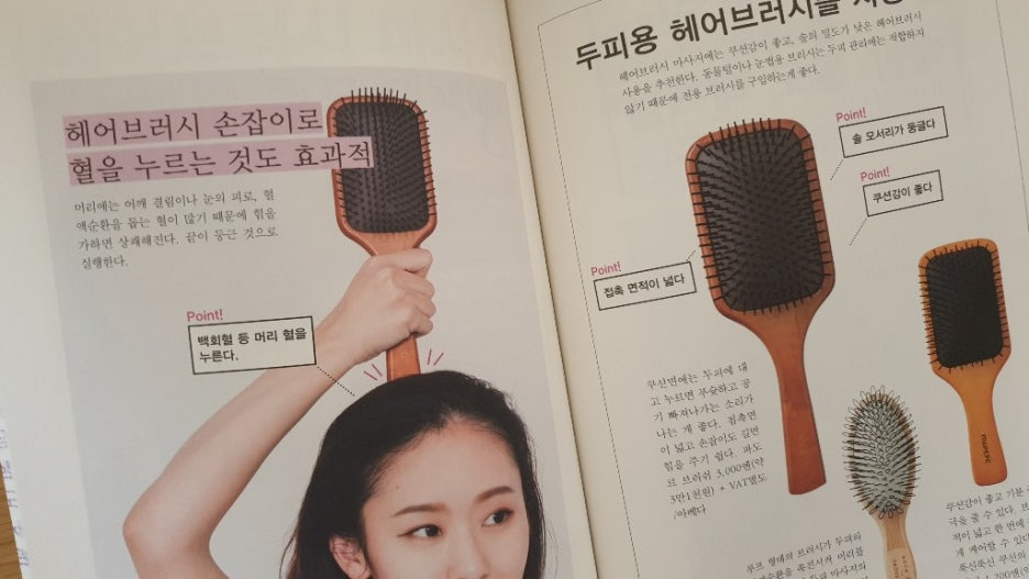 또한 백발이나 탈모도 머리의 뭉침이 원인이므로 머리 풀기를 하면 도움이 된다고 하네요. 백발과 탈모를 방지하는 머리 풀기 방법, 헤어브러시 마사지, 샴푸 하는 법, 머리 말리는 법 등도 소개하고 있어요.