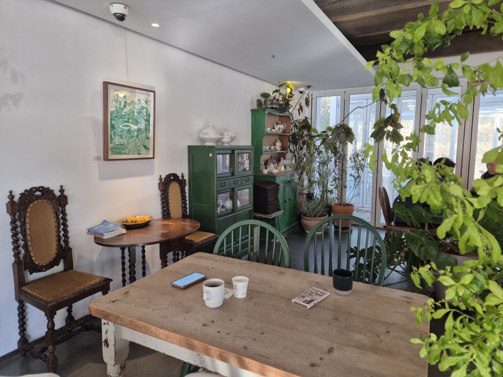 개인적으로 이런 우드느낌의 가구와 식물이 있는 공간을 저는 좋아합니다. 창문 밖으로 산도 보이고 정원도 보입니다.