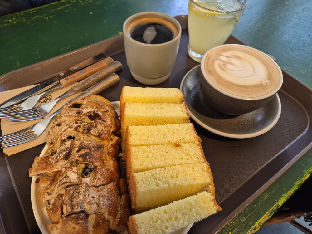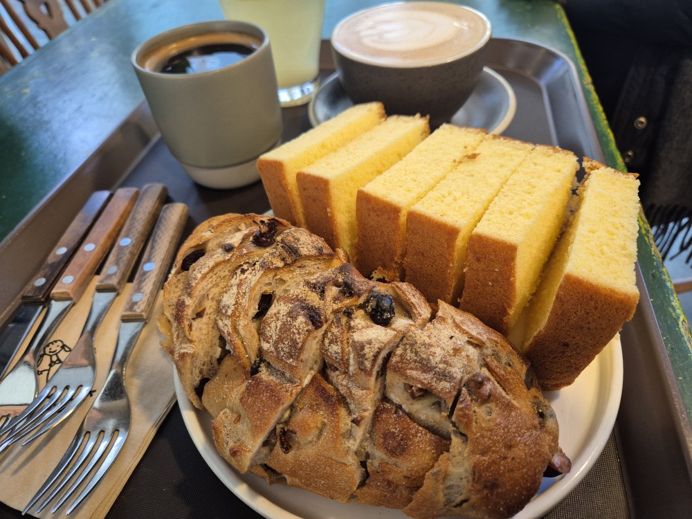 커런츠쌀빵, 카스테라를 주문했습니다. 음료는 아메리카노, 카페라떼 그리고 레몬차를 주문했어요.