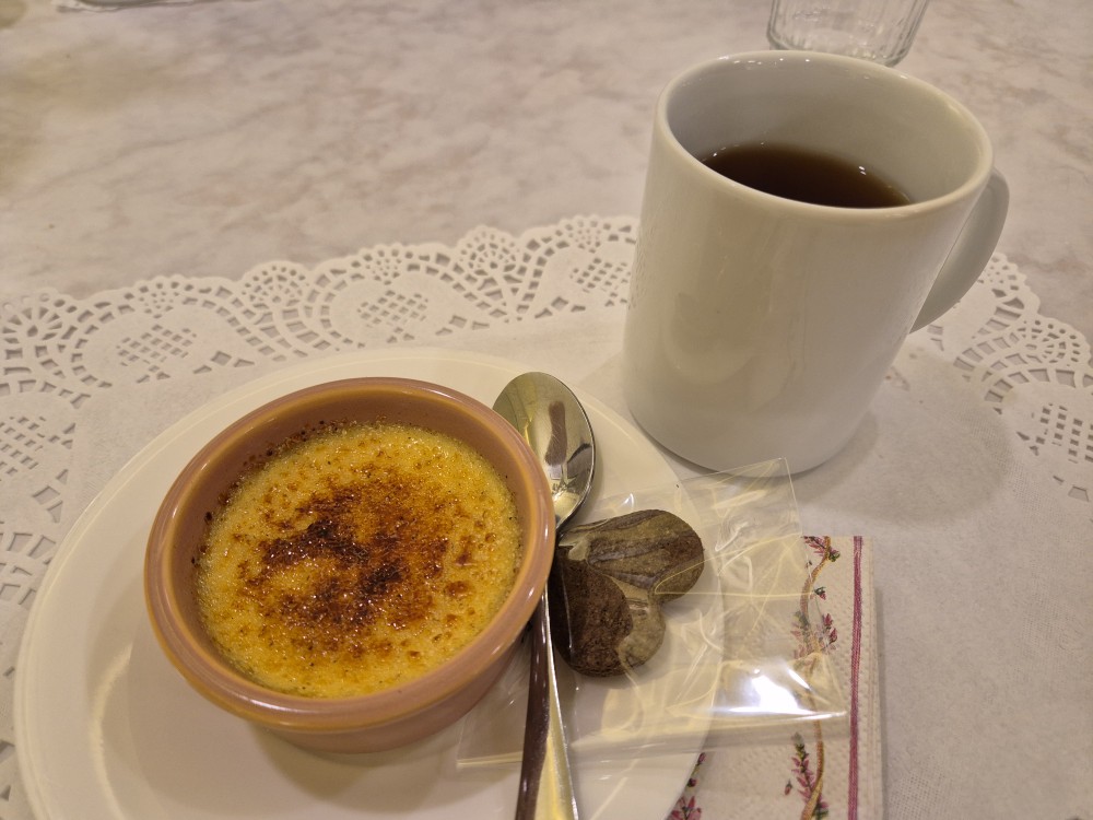 마지막으로 크렘브륄레와 차가 디저트로 나옵니다. 크렘브륄레는 커스터드 크림 위에 설탕을 뿌리고 토치로 설탕을 녹여 설탕 막을 만든 디저트입니다. 바삭하고 달콤한 설탕막과 커트타드 크림의 조화가 좋았습니다. 하트모양의 작은 쿠키도 나옵니다.