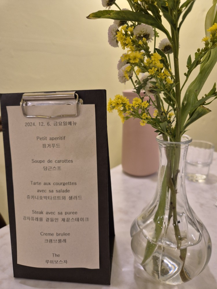 단품은 예약 없이 방문해서 먹을 수 있으나 가정식 코스는 최소 하루 전에 예약을 해야 합니다. 단품(가지라자냐, 아쉬파르망티에, 오늘의 수프)은 몇 가지 먹어보았습니다. 단품이 만족스러웠기 때문에 이번에는 3만 원 프랑스 가정식 코스를 먹어보았습니다. 예약을 했기 때문에 이미 테이블 세팅이 되어 있었고 메뉴도 함께 안내가 되어 있었습니다.
