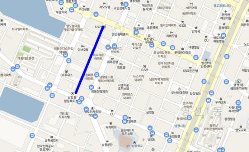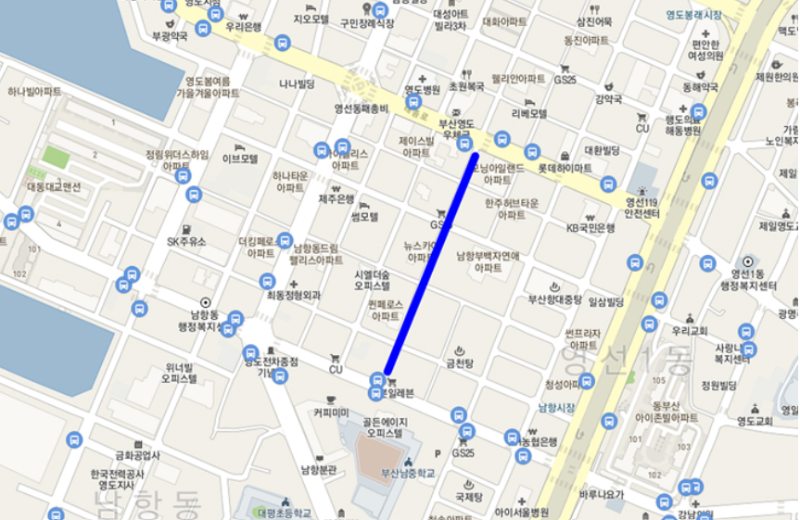 • 남항로 19번길 채플린헤어샵~대교동 부산은행주차장 편측 300m (평일 12:00~13:00)