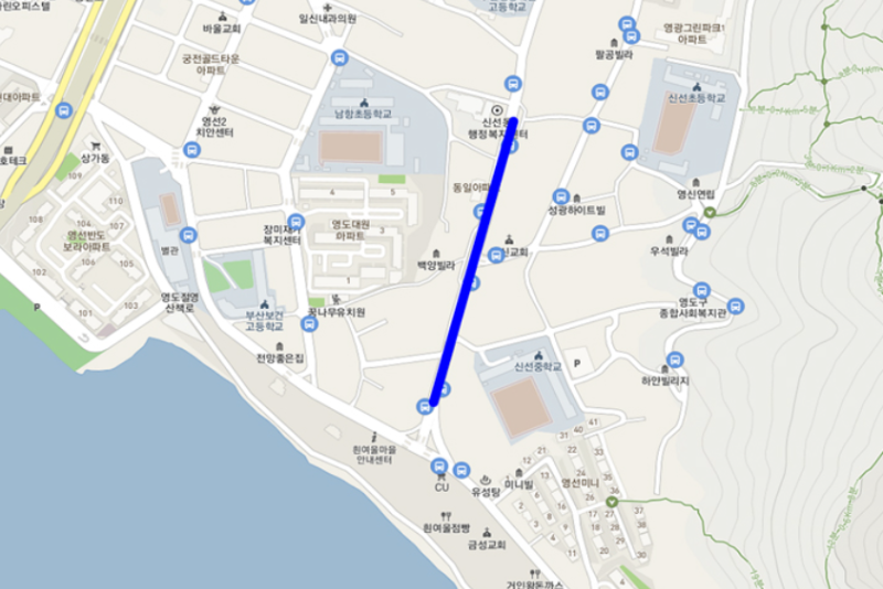 • 절영로 동삼동 113번 종점~절영로 488 해동중학교 입구 편측 370m (평일 12:00~13:30)