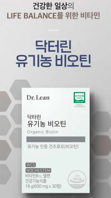- 닥터린 유기농 비오틴 : 식약청 GMP 인증. 불필요한 첨가물 없음. 유기농 원료 95% 이상 사용.