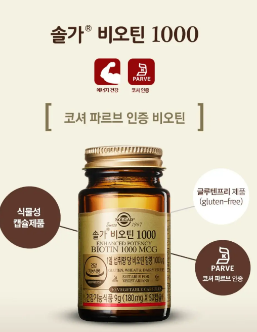 - 솔가 비오틴 1000 : 식물성 캡슐로 크기가 작아 섭취 용이. 유태인 청결 식품 인증마크 코셔.
