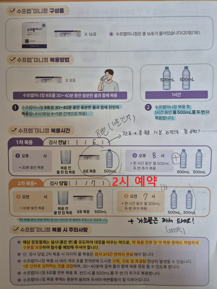 - 아침 7시부터 어제 저녁과 같은 방법으로 장정결제 복용