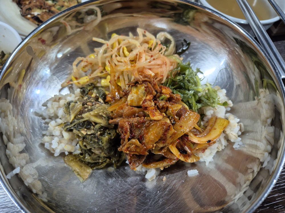 야채 반찬과 제육볶음을 보리밥에 넣어 쓱쓱 비벼 먹으면 속도 편하고 맛도 있습니다.