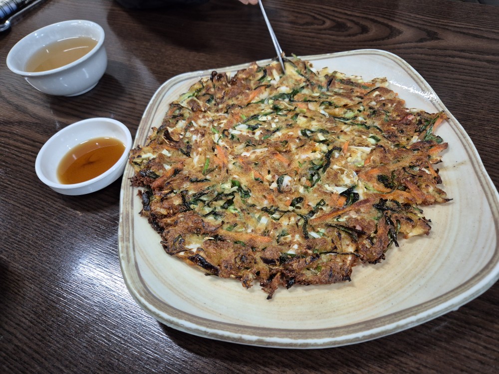 8,000 원하는 부침개입니다. 여러 야채와 오징어가 들어가 있어요. 바로 부친 부침개는 언제나 맛있는 것 같아요.