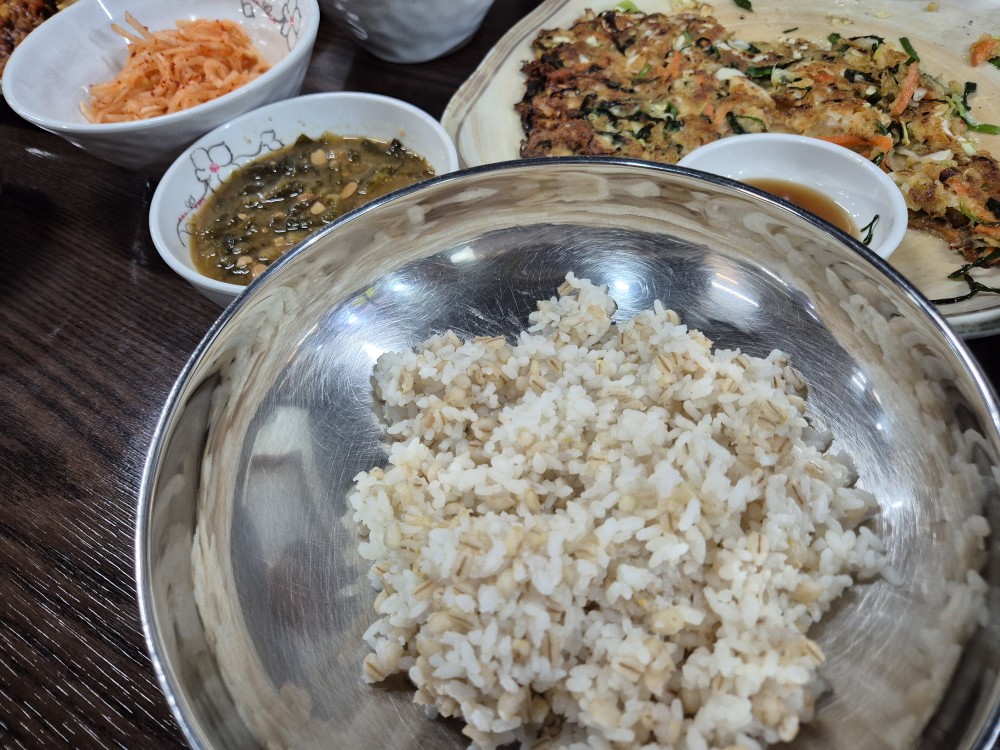 보리밥입니다. 엄청 보리가 많이 들어간 꽁보리밥까지는 아닙니다. 사장님 말씀으로는 꽁보리밥은 손님들이 안 좋아하신다고 하네요.