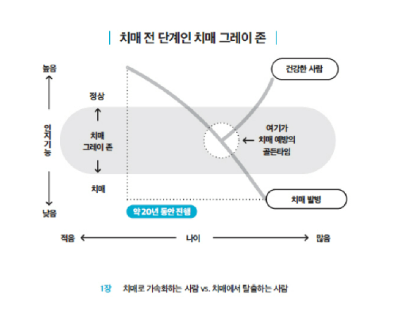 '예전 같지 않다'라고 느낄 때가 치매 예방의 골든타임입니다!! 위 표와 같이 '예전 같지 않다'라고 느끼는 그 시기를 치매 그레이 존이라고 하고 이 시기를 어떻게 보내느냐에 따라 치매 진행 정도가 결정된다고 할 수 있습니다. 그리고 그런 증상이 나타난다면 사실 20년 전부터 병적 변화가 시작되었었던 것이지요.
