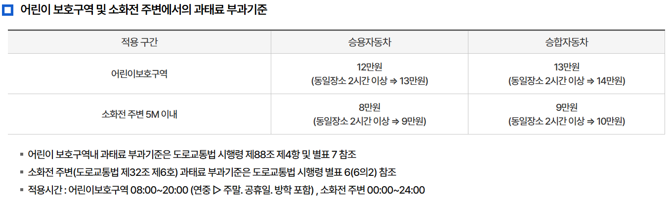 • 주민신고제 : 보도, 횡단보도, 버스정류장, 소화전, 교차로는 365일 24시간 신고 가능, 어린이보호구역은 토일공휴일 제외한 평일 아침 8시~저녁 8시 신고 가능