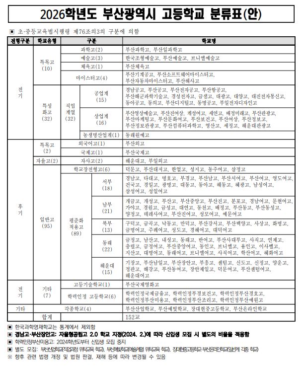 특목고(과학고, 예술고, 체육고, 마이스터고, 외고, 국제고) 12개, 자사고 2개, 특성화고 32개, 일반고 95개, 기타 11개로 총 152개의 고등학교가 부산에 존재합니다.