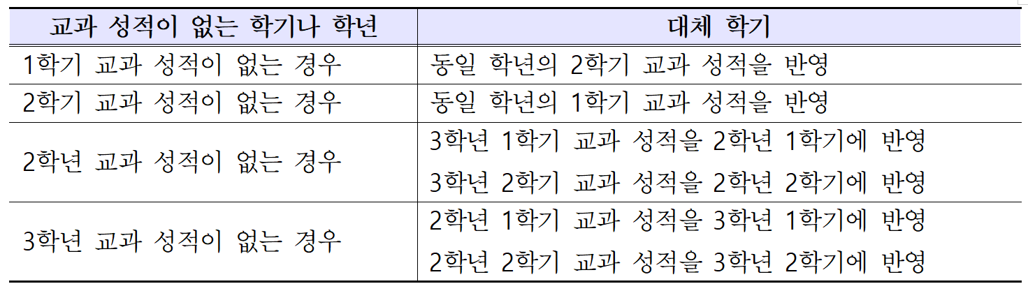 - 조기진급, 재취학, 해외귀국, 조기족업(예정), 자유학기제 등으로 특정 학기나 특정 학년의 성적이 불명확하거나 없는 경우, 성적이 처리된 학기나 학년의 성적을 그대로 적용하여 성적 산출