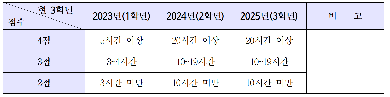 - 현 중3(2010년생)은 1학년 때 5시간, 2학년 때 20시간, 3학년 때 20시간이면 봉사 점수 4점 부여
